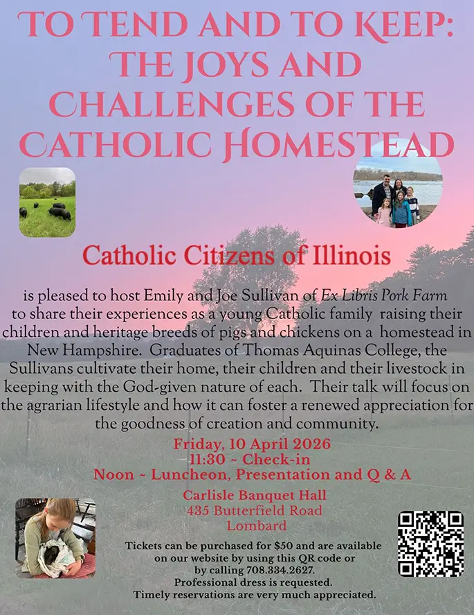 Joe and Emily Sullivan are a husband and wife who have joined legions of young faithful families in the Catholic “homestead” movement. Both graduates of Thomas Aquinas College in California, they are the owners of Ex Libris, a small hog and chicken farm in New Hampshire where they raise exceptional heritage breeds in an environmentally sustainable way. Their goals are both self-sufficiency and community mindedness. They will address the way this intentional, traditional and wholesome lifestyle enables them to live and practice their faith in all areas of their lives and to nurture their children, their livestock, their land and their community in accordance with the God-given nature of each. Their educational credentials in philosophy and technology equip them to discuss their lives and work from a broad and holistic perspective. This talk will be of interest to all Catholics, but may resonate particularly with young adults so please consider inviting your children and grandchildren to join us for this event.