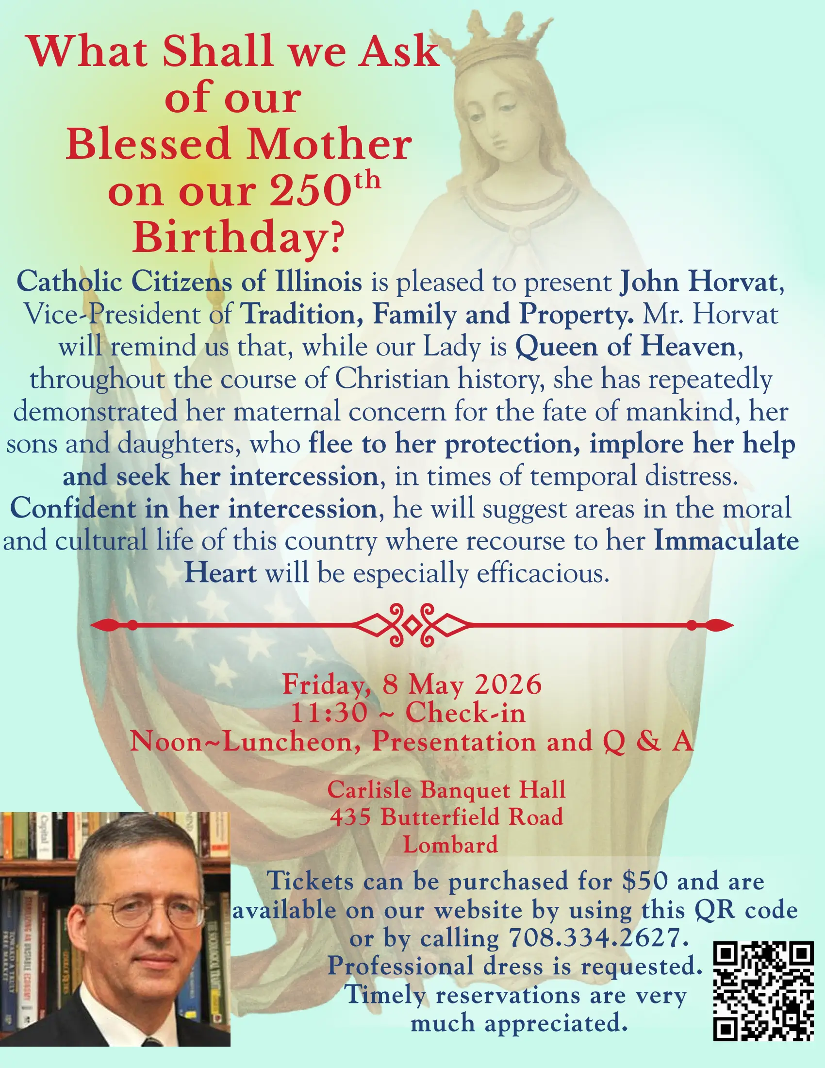 John Horvat, Vice-President of Tradition, Family and Property – On the 250th year of our nation’s birth, America at the same time finds herself both (1) the most prosperous country in history, and (2) in the middle of a great moral crisis unlike any we have seen before. This presentation will deal with our needs as a nation — what we should ask from Our Lady and why we must have the certainty that she will come to our aid.